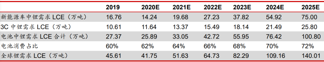 根据GGII的数据,2019年全球锂需求中有60%为电池中的需求,按照电池消费占比和电池中锂需求LCE(固/液锂矿中能够实际生产的碳酸锂折合量)数据,2021、2022年全球的锂需求测算为51.63万吨、64.73万吨LCE。