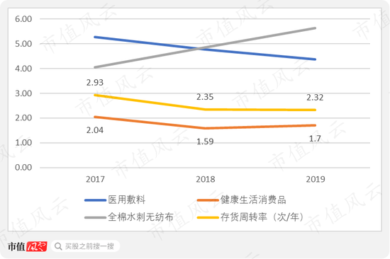 2019年存货周转率为2.32次/年,近三年有所下滑,主要受健康生活消费品的影响,而且2019年医用敷料的周转率也在下降。