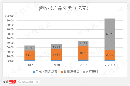 2020年前三季度,医疗辅料营收由11.89亿激增至69.27亿,超过日用消费品,成为整体营收增长的主要因素。