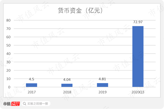 2020年前三季度货币资金为72.97亿,占总资产的58.05%,资产质量高。这72亿除了现金流净流入,还有到位的募集资金。
