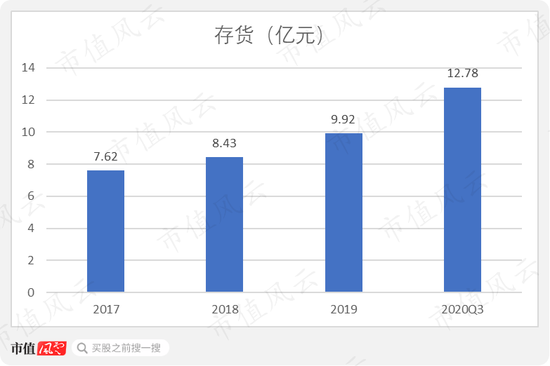 存货金额逐年增加, 2017-2019年存货金额占总资产的20%左右,2020年前三季度存货为12.78亿。