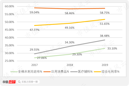 医疗辅料、全棉水刺无纺布毛利率低于综合毛利率,医疗辅料毛利率更高,2019年达38.48%;全棉水刺无纺布毛利率也在逐年上升,2019年达33.1%。