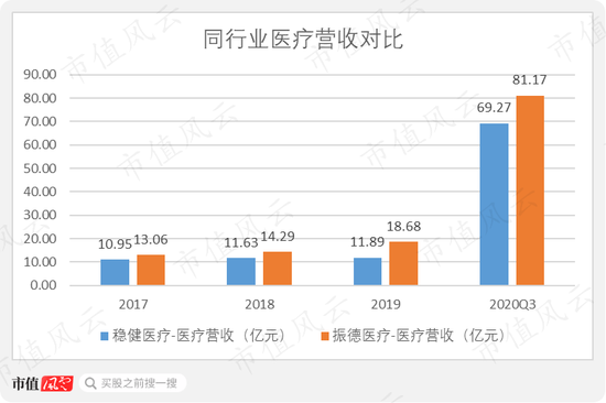 同行业振德医疗(603301.SH)也由于疫情带来的防护及消毒产品需求增加,推动营收增长,2020年前三季度营收为69.27亿,营收增速为531.49%,略逊于稳健医疗。