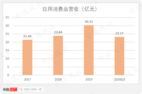 可以看出,生活消费品板块的营收稳中有升,2020年前三季度日用消费品业务营收为23.17亿,同比上升16.25%。