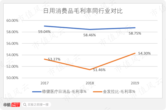 可见日用消费品的毛利率很高,在50%-60%之间。2019年稳健医疗日消品毛利率为58.75%,高于金发拉比的54.3%。