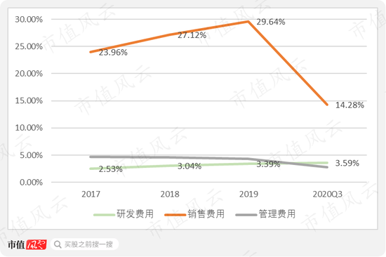 2020年前三季度销售费用率下滑,并不是费用管控更好,而是由于营收激增。截至2020年三季报,销售费用已达13.6亿,超过2019年全年金额。