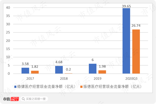 2020年前三季度稳健医疗的经营现金流量净额达到39.65亿,增速为560.83%;2019年在正常情况下经营现金流量净额仅为6亿。