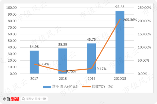2020年前三季度,营收增长迅猛,实现营收95.23亿,同比增长205.36%。
