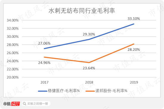 稳健医疗2019年全棉水刺无纺布毛利率达33.1%,略高于同行业的诺邦股份。