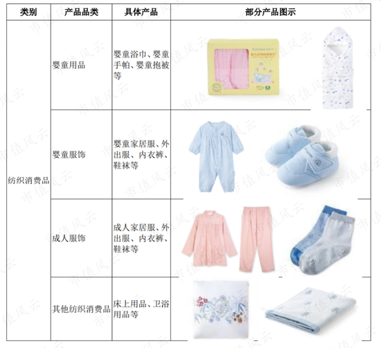产品包括纯棉柔巾、全棉表层卫生巾、纯棉湿巾等无纺类消费品及婴童用品、婴童服饰、成人服饰等纺织类消费品。