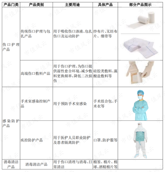 具体包括高端伤口敷料产品、传统伤口护理与包扎产品、手术室感染控制产品、疾控防护产品及用于体表清理的消毒清洁产品。