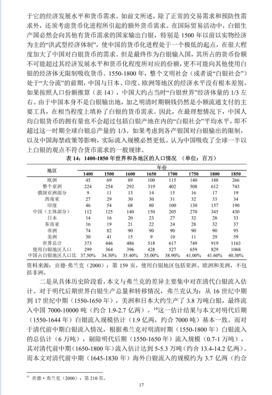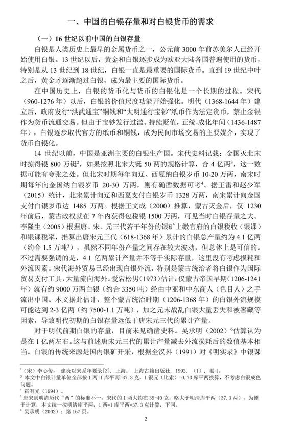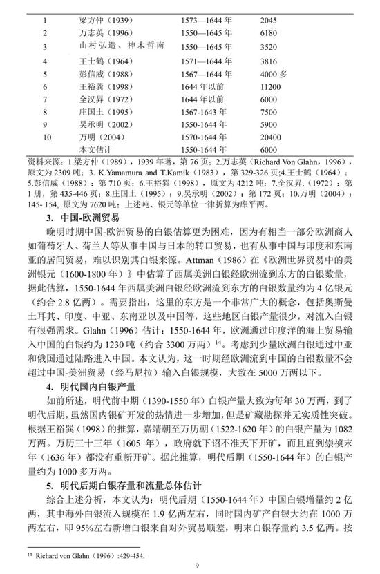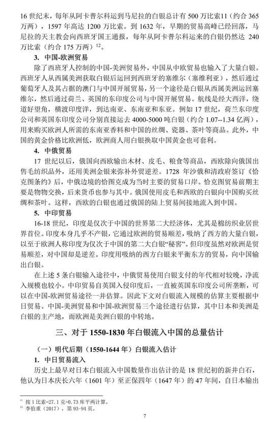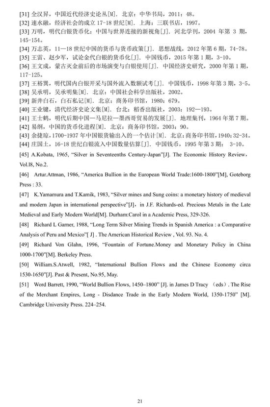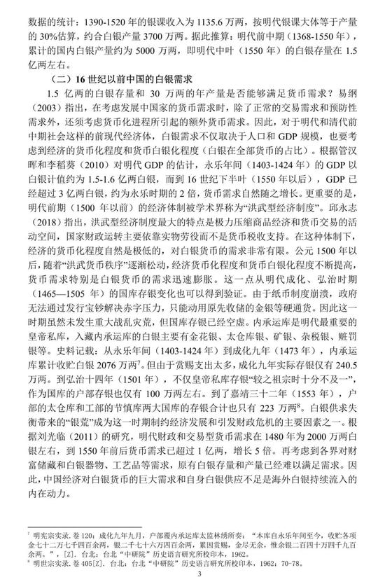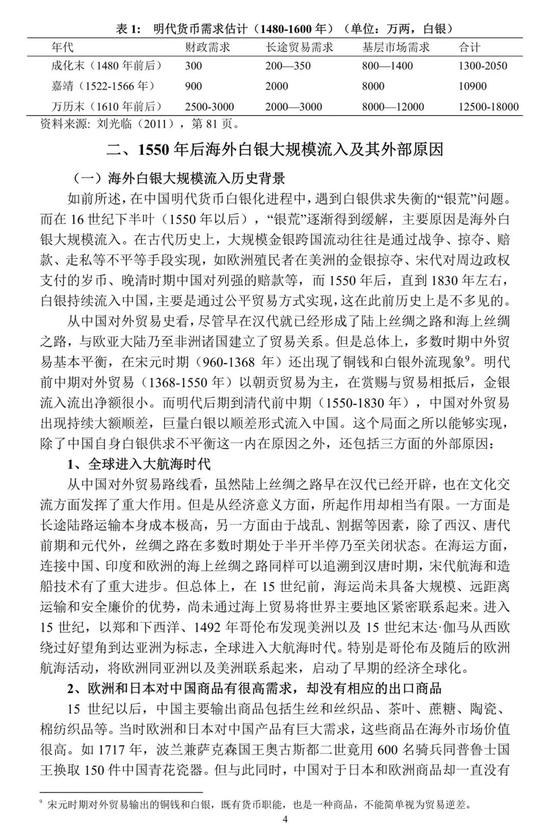 摘 要:本文基于白银历史存量与货币需求,对明代后期到清代前中期(1550-1830年)的白银跨境流动进行估算,分析了海外白银流入中国的影响。主要结论包括四个方面:一是当时中国本土白银有限,难以满足国家财政运转和市场交易的货币需求,这成为海外白银持续流入的内在动力;二是初步估算在1550-1830年间,通过贸易顺差净流入中国的海外白银约为5.6亿两(约合2.1万吨),海外流入白银约占中国同期新增白银的90%,大致占同期全球白银总产量的15%左右;三是海外白银流入标志着中国传统货币政策的终结,重塑了国家财政运作形式,改变了东亚贸易模式和中国国内生产流通格局;四是中国货币需求对于全球白银流动和早期经济全球化的影响被过分夸大。