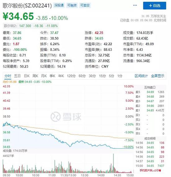 1月28日,歌尔股份放量跌停,收报34.65元,换手率6.24%,成交额62.43亿元。盘后数据显示,深股通卖出5.16亿元并买入4.49亿元,一机构卖出2.27亿元,四机构买入3.79亿元。
