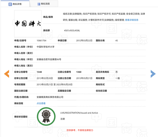 在中国商标网查询发现,“中国科大”注册商标的申请人为中国科学技术大学。