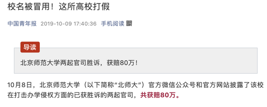 此前报道,2019年8月,北师大“清尘计划”维权打假第一案在海淀区法院一审宣判,被告北京某教育科技有限公司因违规冒用北师大名义举办培训被认定构成不正当竞争,赔偿学校经济损失计40.1万元,并在网站公开道歉,消除影响。