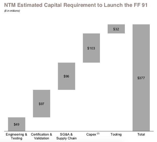 FF还详细列出了首款电动车从完成融资到实现上市销售过程中所需要投入的资金总量,大约为3.77亿美元,其中工程和测试需4900万、核检9700万、供应链和管理费用9600万、资本投入1.03亿。