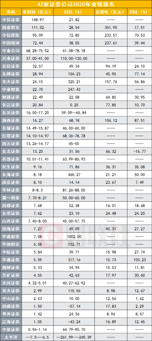 截至记者发稿,42家券商发布了2020年年度业绩,总计实现净利润903.22亿元至922.05亿元,平均增速为98%至103.27%。净利润排名居前的5家券商分别是中信证券(148.97亿元)、国泰君安(111.02亿元)、中信建投(95.09亿元)、中国银河(72.44亿元)、中金公司(68.28亿元至75.52亿元),同比增速分别为21.82%、28.54%、72.85%、38.55%、61.08%至78.18%。