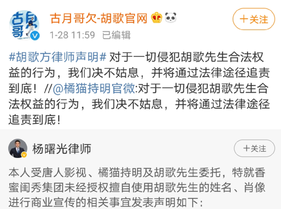 1月28日,微博认证为北京市安理律师事务所合伙人的杨曙光律师发布微博称,其受唐人影视、橘猫持明及胡歌委托,特就香蜜闺秀集团未经授权擅自使用胡歌的姓名、肖像进行商业宣传的相关事宜发表声明。