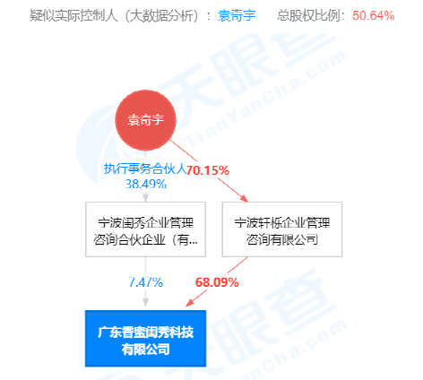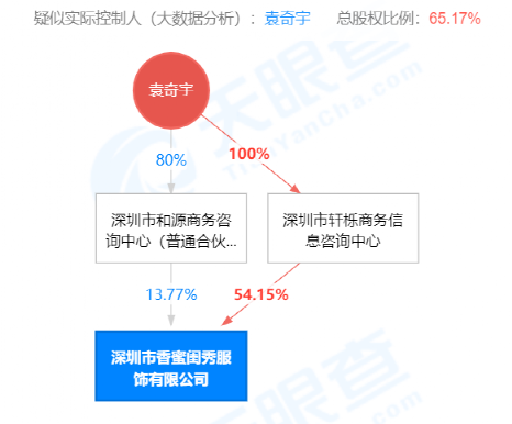 天眼查网站显示,该两家公司法人代表均为袁奇宇,其中,袁奇宇持有深圳市香蜜闺秀服饰有限公司65.17%的股份,持有广东香蜜闺秀科技有限公司50.64%的股份。