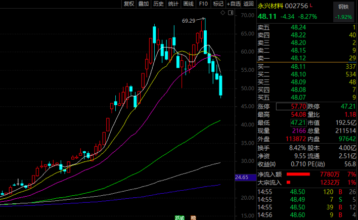 永兴材料锂电池概念中的大牛股,周一一度创出历史新高的69.29元,2020年全年涨幅超过两倍。该股本周出现较大调整,累计跌幅接近27%。