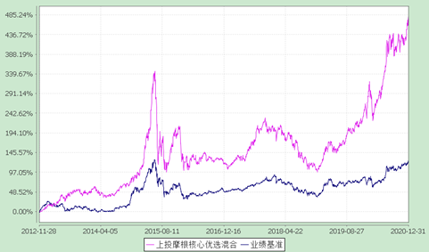 孙芳2011年成为基金经理,2012年11月开始独立管理新成立的基金上投摩根核心优选。银河证券数据显示,截至2020.12.31,该基金成立以来累计回报483.23%,成立以来年化回报24.34%。