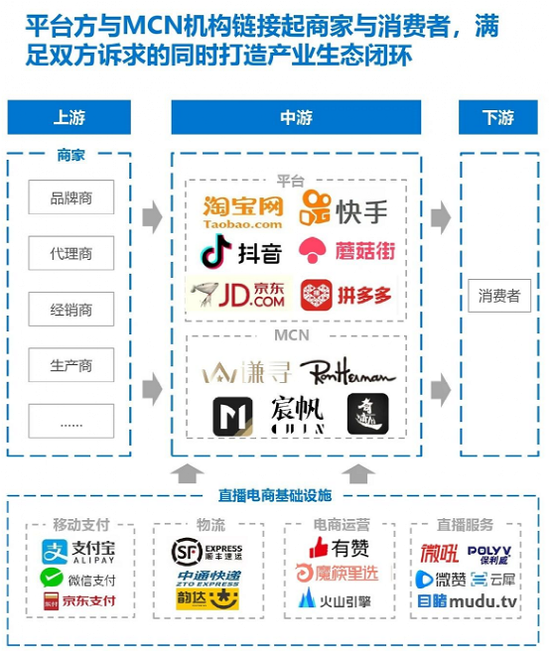 资本投行、商家、平台、MCN机构和主播是直播电商行业的主要参与方,在其中各司其职,商家提供产品基础,主播及其背后的MCN机构以直播为媒介传递商品信息,通过平台实现商品至消费者的触达。