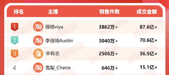 除了薇娅之外,李佳琦、辛有志等也是直播带货的头部力量。2020年双11也使得直播带货迎来一波小高潮,数据显示,双十一期间近3亿看直播,从淘宝、抖音、快手TOP50主播的销售数据来看,薇娅的排名依然拔得头筹。根据胖球数据来看,薇娅销售商品3862万件,成交金额87.6亿元。而排在第二位的李佳琦销售商品3070万件,成交金额70.6亿元;辛有志以36.5亿元总销售额排名第三,销售商品2506万件,货单价略低。