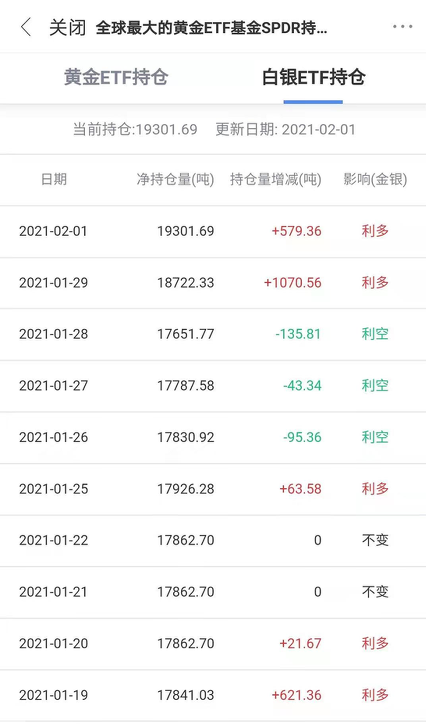 热点栏目美国时间2月1日,全球最大白银ETF--iShares Silver Trust(SLV)持仓较上日增加579.36吨,当前持仓量为19301.69吨。