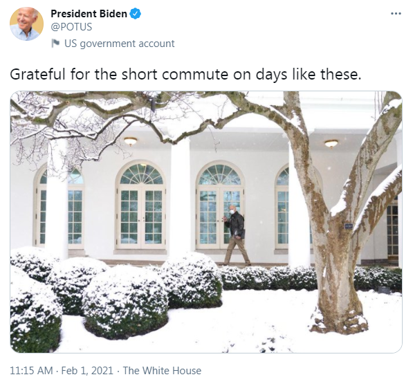 当地时间1月31日22时许,拜登在推特上发布了一则推文:“感谢在这样的日子里短途通勤。”这则推文还配上了一张照片。照片中,白宫内已是白雪皑皑。拜登正走在白宫西翼的走廊上,照片中的他穿着深色夹克,戴着口罩,左手还拿着一个文件夹。↓