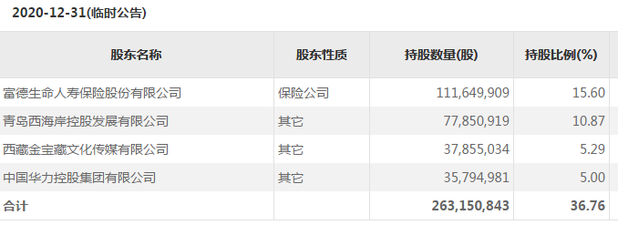 目前,北京文化既没有控股股东,也没有实际控制人。截至2020年12月31日,北京文化持股超过5%比例的大股东分别是:持股1.11亿股的富德生命人寿保险股份有限公司(简称“富德生命人寿”)、持股7785.09万股的青岛国资委旗下青岛西海岸控股发展有限公司(简称“青岛西海岸”)、持股3785.50万股的西藏金宝藏文化传媒有限公司以及持股5%的中国华力控股集团有限公司(简称“华力控股”)。