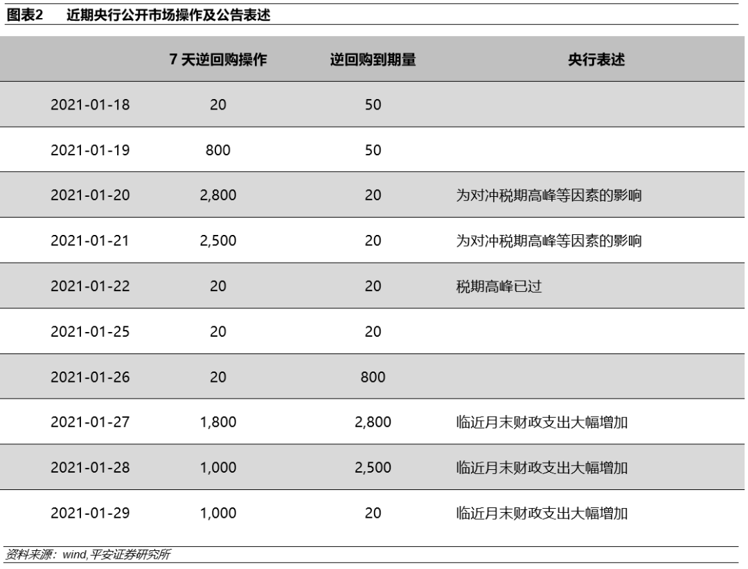 流动性之所以出现如此转向,直接原因是央行流动性投放的减少。央行从1月18日开始公开市场“地量”操作,逆回购量从50亿元再降到20亿元。1月20日、21日央行重新加大公开市场操作,在公告中明确指出是“为对冲税期高峰等因素的影响”。1月22日重新回到20亿元逆回购操作,并指出“税期高峰已过”。1月27日,税期高峰所投放的逆回购到期,央行缩量操作投放流动性,并指出这是由于“临近月末财政支出大幅增加”。月末时点,央行公开市场操作净回笼,且1月15日的MLF操作也是缩量续作(1月有3000亿元MLF、2405亿元TMLF到期,共5405亿元,央行操作5000亿元),从而触发了流动性收紧。