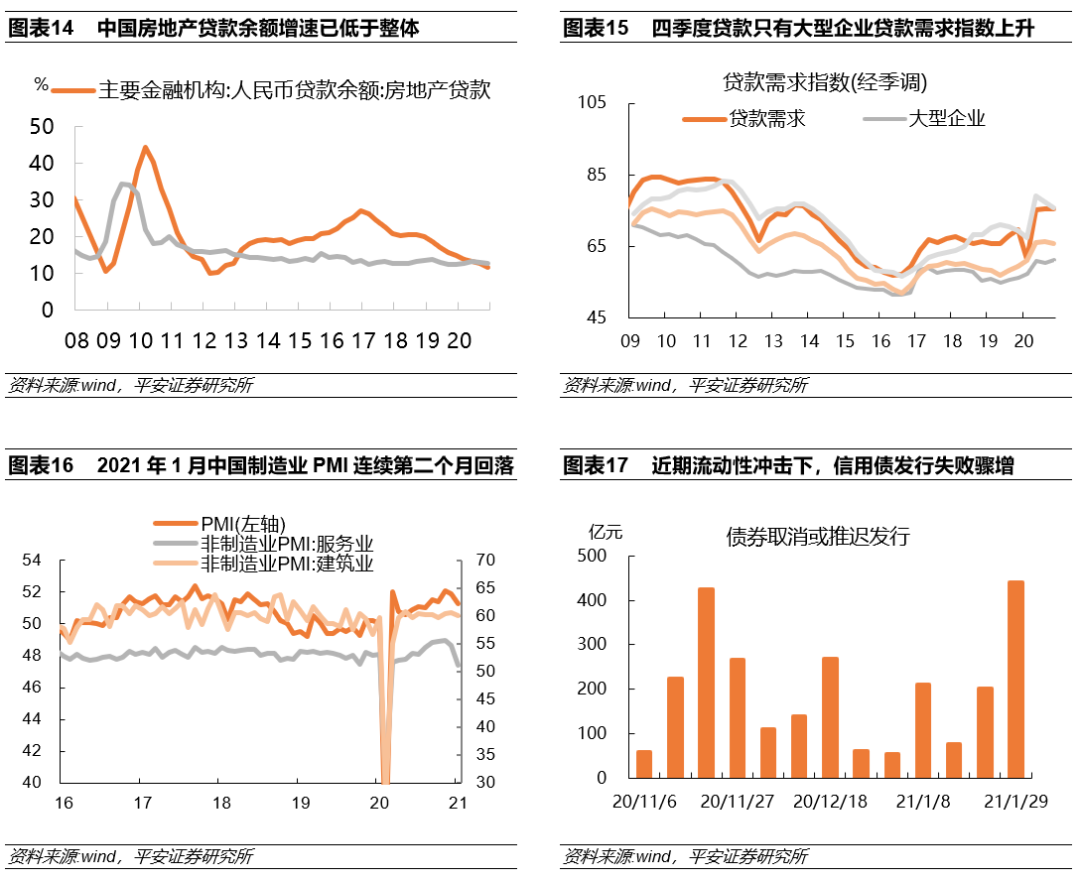 问题在于,实体经济能不能提供较强的贷款需求?从2020年四季度贷款需求指数来看,只有大型企业的季调指数还在上升;2020年四季度中国实际GDP的季调环比已现回落;2021年1月,在疫情影响服务业PMI大幅回落的同时,中国制造业PMI也连续第二个月回落。这些都表明,贷款需求已经有见顶迹象。特别是,在近期流动性收紧的情况下,我们很快就看到了信用债取消或推迟发行量大幅攀升,侧面体现出实体经济对利率波动的敏感性。因此,在严监管的背景下,信贷政策还是需要保持积极的取向。