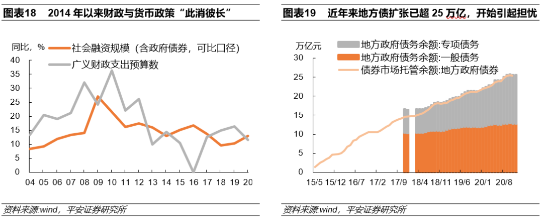 结合历史来看,紧货币+紧财政的政策组合对于中国经济的伤害还是非常严重的(譬如2013年双紧之后,2014年初经济状况急转直下)。从2014年之后,财政支出和社融增速就保持着“此消彼长”的关系。到2020年,地方债从2015年的1.2万亿元,短短6年时间已经扩张到超过25万亿元。围绕地方债务率进入警戒区间、地方专项债使用不规范等问题,已经引起高层关注。2021年,如果财政政策注定要有所退坡,那么货币政策就要相应调适一些,形成“稳货币(政策)+偏紧财政(政策)”的政策组合。