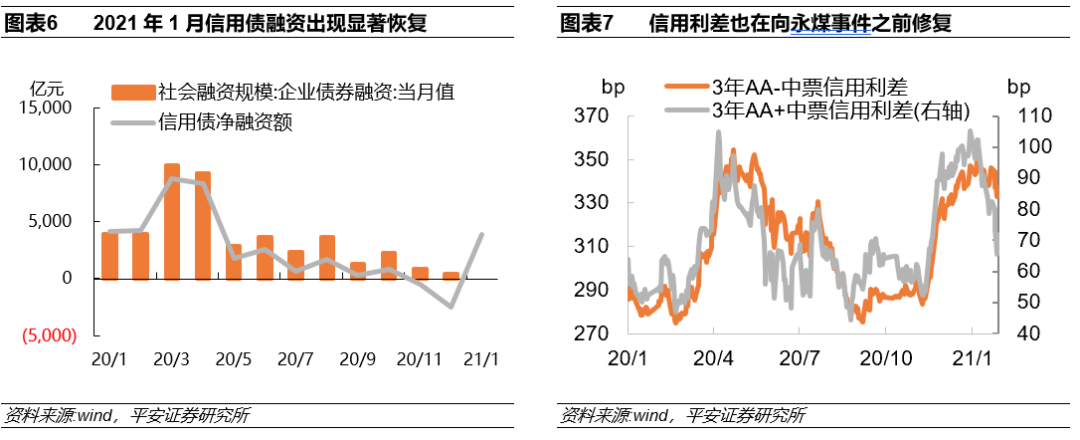 2020年12月社融超预期低的原因是信用债融资规模进一步走低、信托贷款突击压降,而2021年1月以来,信用债净融资规模出现显著好转,中高等级信用利差也快速回落。加之2020年的硬性监管指标已经完成,金融机构寻求“开门红”,资金融出热情也较高。在此情况下,释放偏紧信号不易对实体经济形成明显的衍生冲击。