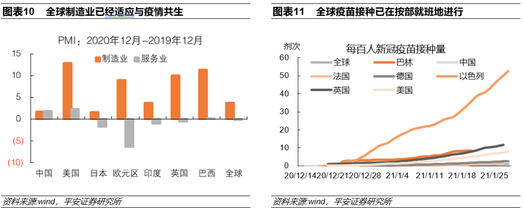一方面,全球制造业已经适应与疫情共生,到2020年12月,主要国家制造业PMI均已显著超出2019年12月疫情之前的水平,全球制造业进入共振复苏阶段。疫情的影响基本局限在受社交隔离影响的服务业中,对经济的损伤已经大大减弱。