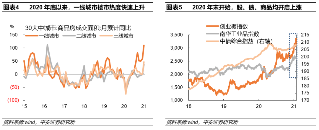 2)2020年11月以来,资本市场表现为股、债、商、汇同步走强。创业板指数开始接近2015年高点,爆款基金“出圈”;南华工业品指数逼近历史高点,PPI呈加速上行之势;债券市场在经济复苏的不利条件下也走出了一波“抢跑”行情;人民币汇率更是开年大升,突破6.5关口。大类资产同步上涨,无疑是货币宽松把它们统一在了上涨逻辑中。