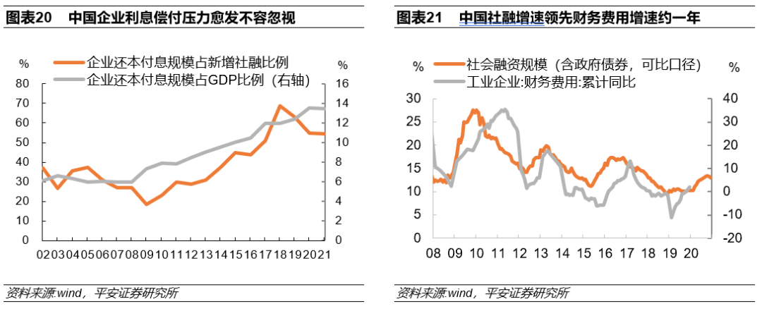 做个简单测算,将剔除政府债券、ABS、贷款核销的社融存量,按照5%利息成本计算企业每年的利息偿付规模。可见从2009年开始,企业每年的利息偿付占中国GDP的比重持续攀升,到2020年已达13.5%。企业利息偿付占新增社融的比重,2018年一度升至68.8%,2019、2020年由于政府债券的大规模发行,这一比例才有所下降,但2020年仍高达54.8%。按照2021年社融增长10.5%、名义GDP增长10.5%计算,上述两个比例与2020年相近。在此情况下,需要注意一旦融资成本上升或社融增速显著下滑,可能导致的冲击。历史上,社融增速对企业财务费用有约1年的领先性,背后体现的就是还本付息的压力。2021年还本付息会自然导致信用环境收缩,紧信用更加需要拿捏好力度(这也是全球央行所谓“覆水难收”的关键原因之一)。