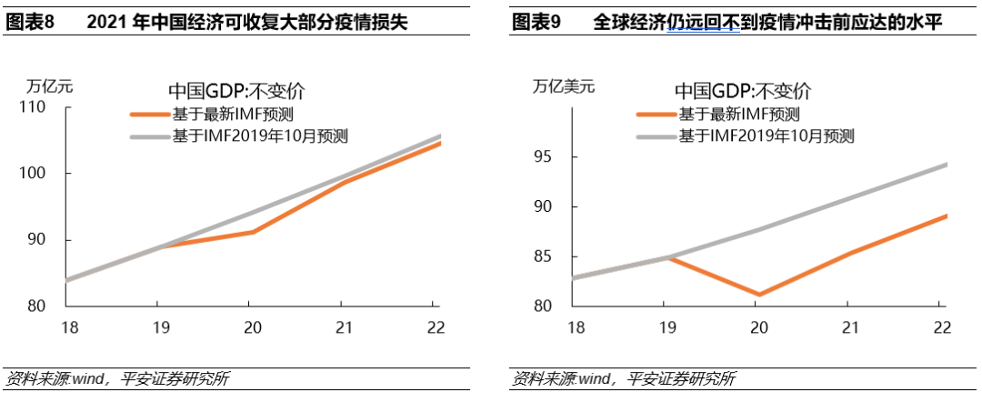 我们以国际货币基金组织(IMF)在2019年10月的全球经济展望,作为没有疫情影响情况下全球经济本应达到的增长水平,以此为参照衡量疫情所造成的经济损失。按照IMF预测(2021年中国不变价GDP增长8.24%),中国到2021年就基本可以回到没有疫情冲击的路径中;但全球经济大为不同,不仅2020年所遭受损失巨大,而且在未来至少两年内都回不到没有疫情冲击的路径。这是中国“货币政策正常化”的最根本基础。2020年中国为应对疫情,宏观杠杆率以接近2009年的节奏快速攀升,前三季度已上升27.7个百分点,杠杆率超过270%;根据中国社科院预计,全年宏观杠杆率上升30个百分点左右。当疫情影响有望得到大部分修复时,释放一些稳杠杆信号是必须也可行的选项。