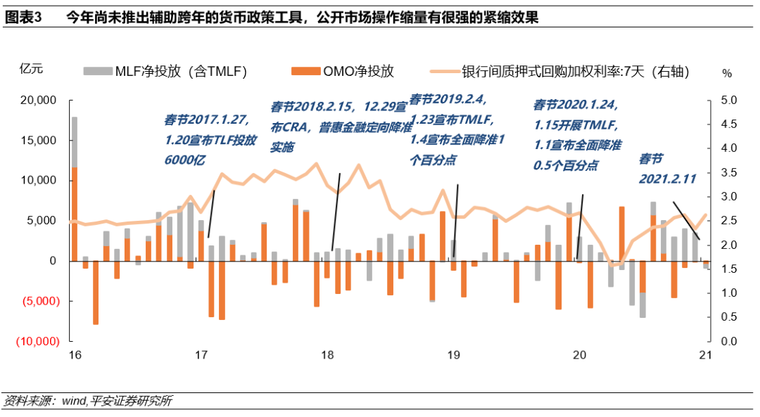 回顾2016年以来的春节流动性投放:2016年是OMO+MLF均大额放量,保证了流动性平稳过节。2017年公开市场净投放不算大,但在春节前7天时推出了TLF(临时流动性便利)创新工具,投放资金6000亿元,使得流动性平稳过节。2018年公开市场净回笼资金,但依靠力度更大的CRA(临时准备金动用安排)创新工具,以及普惠金融定向降准落实,也保证了春节前后流动性宽松。2019年在春节前12天时推出了TMLF(定向中期借贷便利)创新工具,以及1个百分点的全面降准,保证了流动性平稳。2020年开年全面降准0.5个百分点,并在春节前9天时开展TMLF操作,流动性虽出现阶段性紧张,但很快得到了缓解。