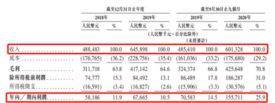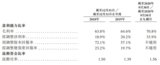 而比起快速的增长速度,令人瞩目的恐怕是它的毛利率水平。据招股文件显示,2018年至2019年,该公司的毛利率分别为63.8%、64.6%,逐年提升;而经调整净利率期内则为18.9%、20.2%,亦不断提升。