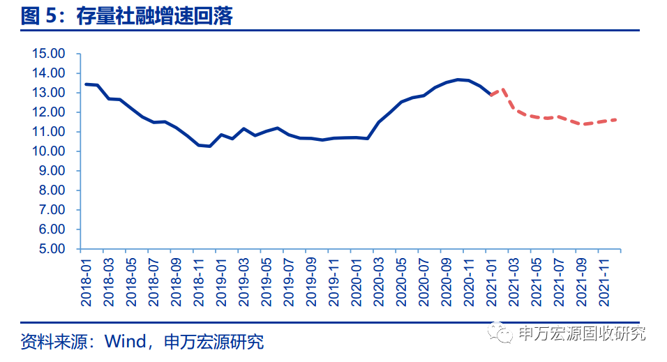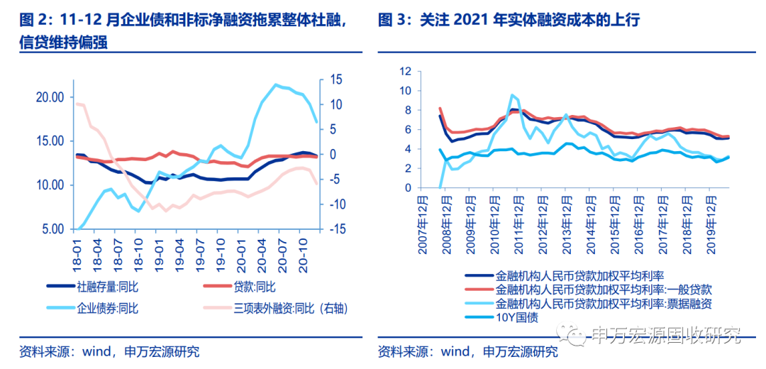 对于社融来说,企业债和非标融资的负面拖累预计仍在,而且财政政策力度减弱后,政府债券融资部分也将显著回落,但随着生产投资需求的恢复和上行,预计信贷增速仍然偏强,综合来看,预计2021年社融增速回落至11%左右。