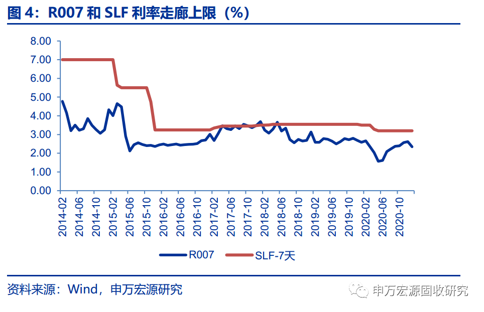 基于我们在《2021年:反转年——2021年利率债投资策略》的判断,我们继续维持下半年见高点的观点不变,从R007中枢的高点看,如果以SLF7天作为利率走廊上限看,在不加息的情况下,R007中枢超过3.2%的概率不大,但预计下半年季度中枢将见到3%。