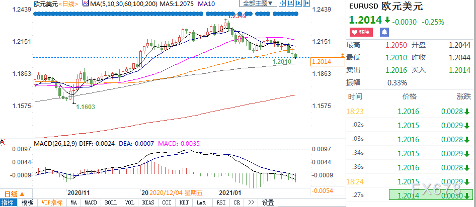 分析认为,由于欧洲疫苗接种运动的滞后,欧元兑美元一直未能反弹,在跌破三重底1.2050之后,将延续跌势,美国民主党可能会选择通过全面的经济刺激法案,推高收益率和美元。