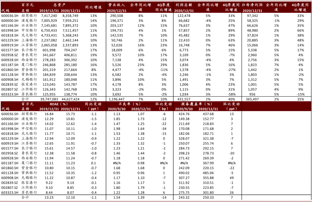 图表: 根据上市银行2020年业绩快报,4Q20平均营收同比增长10%,平均净利润同比增长35%;资产质量指标改善