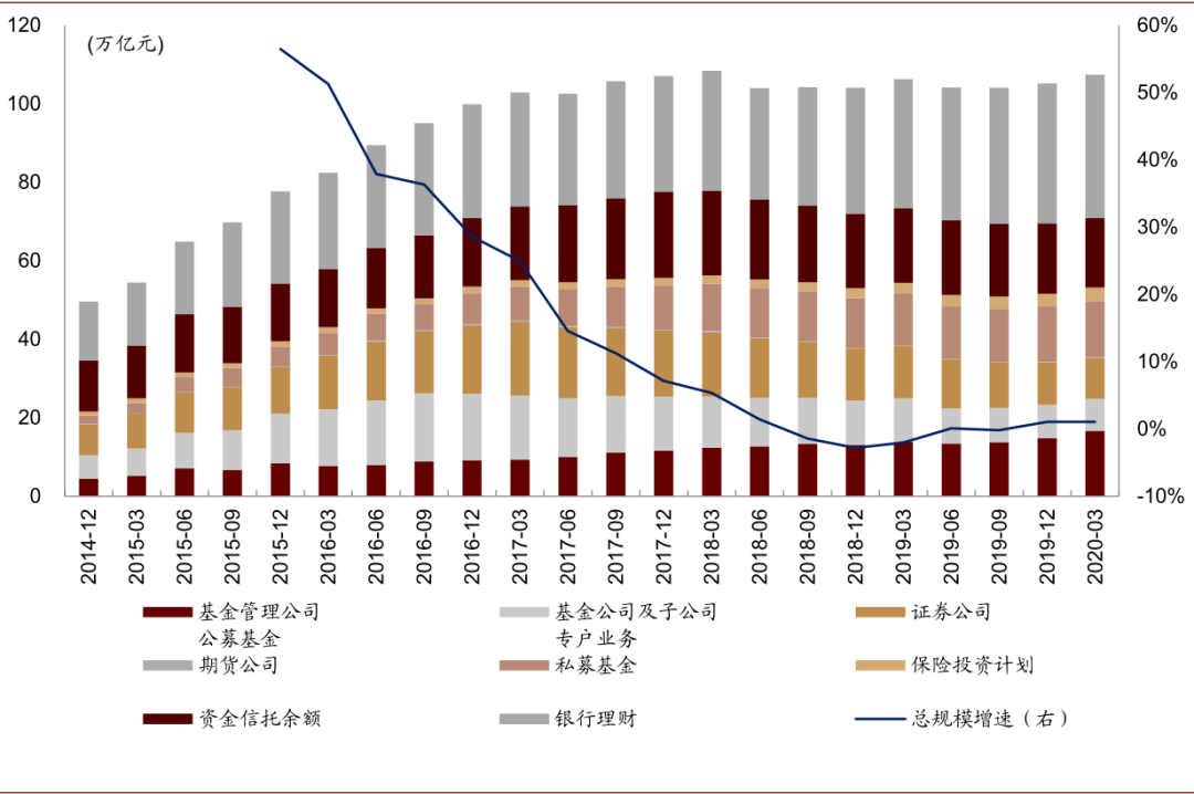 图表: 不考虑嵌套,我们估算3Q20末中国资管行业规模97.5万亿元,同比增速由2018年的-5.7%转正至5.4%