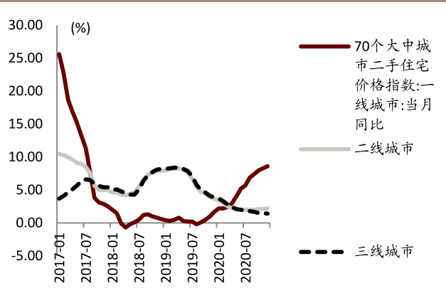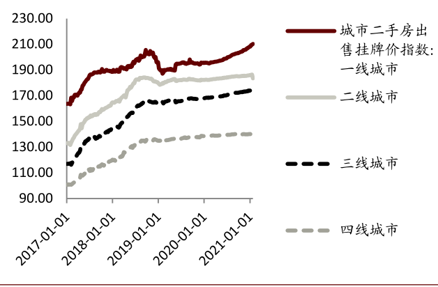 ► 70个大中城市二手住宅价格指数中一线城市同比增速由2020年1月的2.2%上升至12月的8.6%,一线城市二手房出售挂牌价指数较去年末上升7.6%;股票资产价格亦表现较好,截至2021年1月29日,上证综指较2020年3月的底点上涨31%。