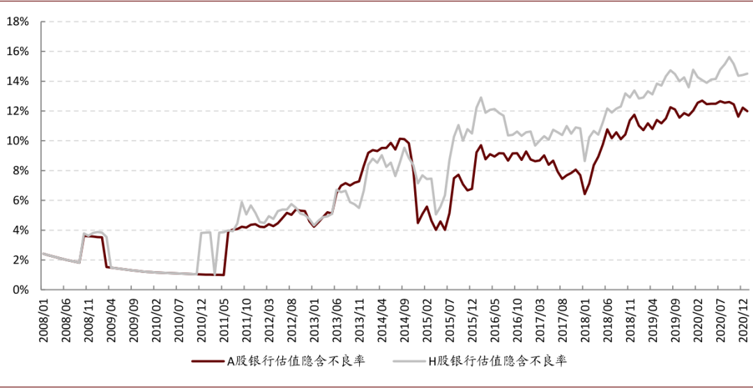 图表: A/H银行股估值银行不良率分别为12.0%和14.5%