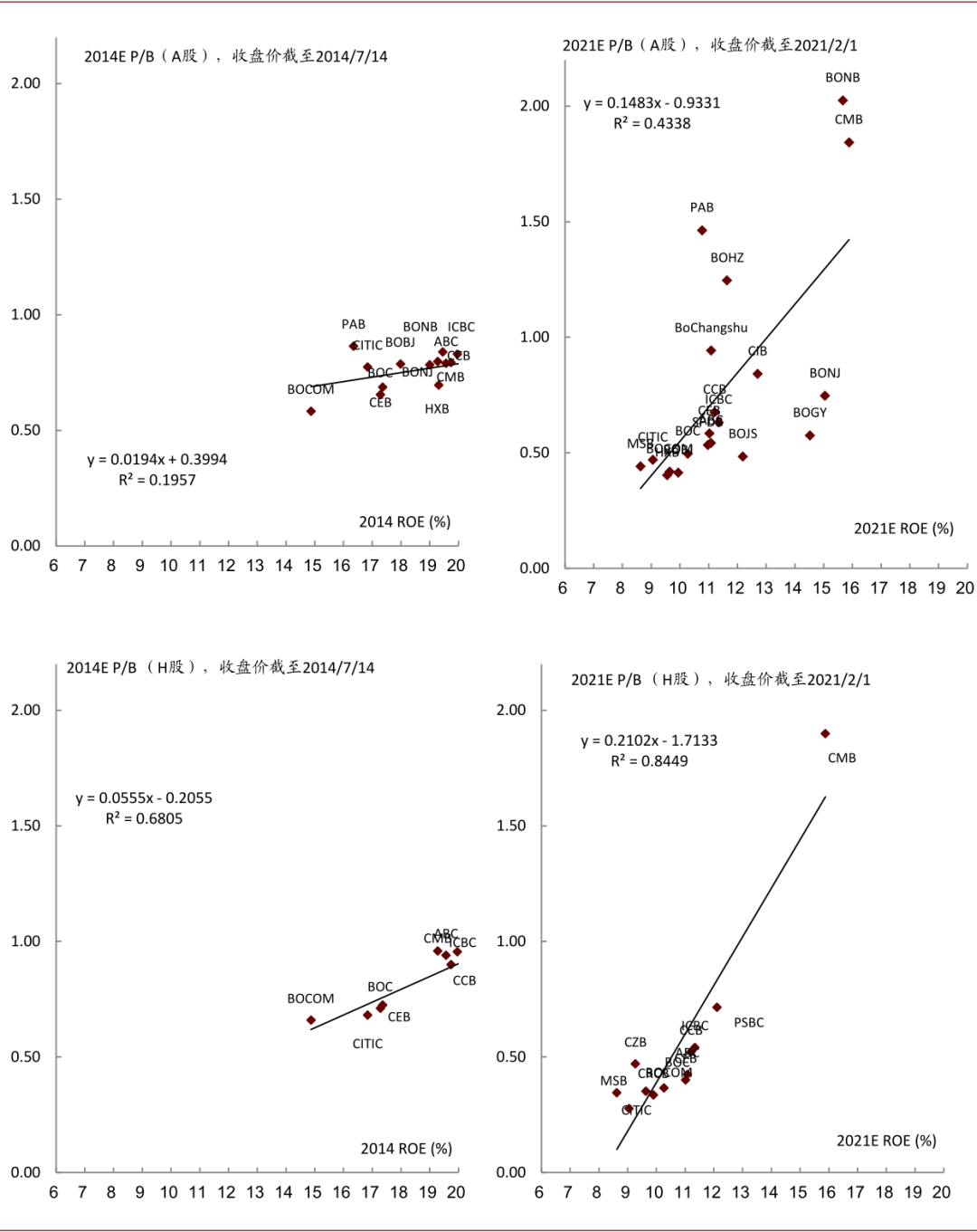 上述风险固然存在,但我们再次重申,1)当前A/H银行股交易于0.86/0.72x 2021e P/B(当前估值隐含不良率为12.0%和14.5%),其中除了招行、平安、宁波、杭州估值创新高,其余银行估值均处于较低水平,已反映较多上述风险预期。举例而言,A股工行、建行、农行仅交易于0.63、0.67、0.54x 2021e P/B,H股工行、建行、农行仅交易于0.54、0.52、0.42x 2021e P/B,均处于过去5年均值下方。2)行业情况不代表个体情况,我们认为以可持续盈利和轻资本运营为经营目标、跟随中国经济和融资结构调整积极优化资产结构和业务模式的商业银行在中长期值得更高的估值溢价。