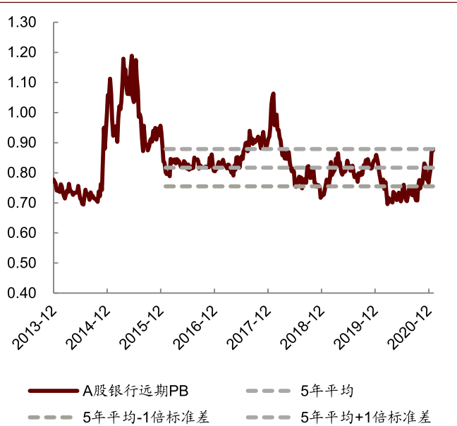 图表: A/H银行股目前交易于0.86/0.72x 2021eP/B,头部几家银行估值屡创新高,而多数银行估值低于均值水平
