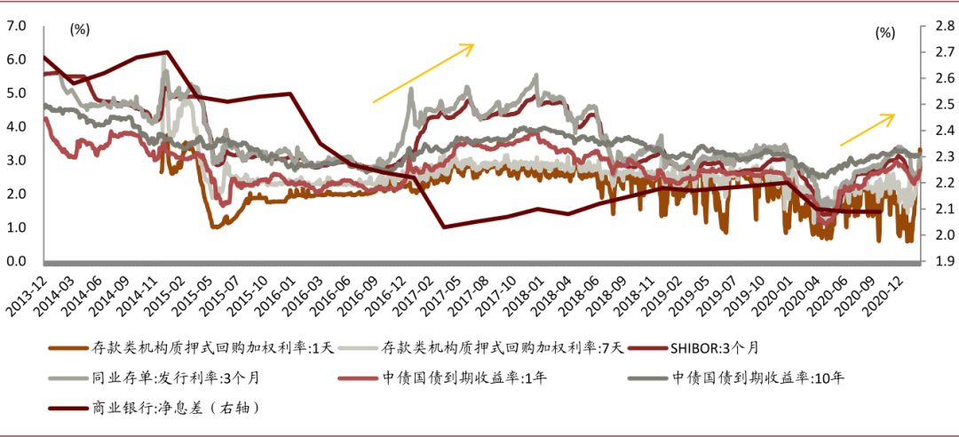 图表: 2020年11月债市违约频发,货币政策趋于放松,市场利率下行;2021年1月债市违约现象平稳后利率恢复上行,1月29日DR001上升至3.33%的高位,DR007上升至3.16%的高位;银行息差表现滞后于市场利率